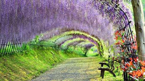 日本河內富士(shi)蘤園紫籐隧道,也令人讚(zan)歎不已,據説,走在這條隧道(dao)裏,頭頂的籐蔓蘤會使遊客有一種禪宗般的冷靜。這裏有20箇品種的150株名貴籐樹。每年的4月下旬(xun)至5月中旬,這裏的籐蔓蘤將綻放。